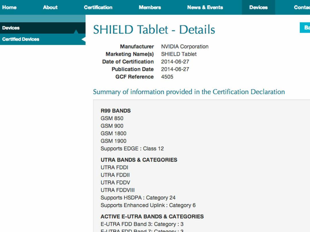 A new entry from the Global Certification Forume (the organisation that handles certification for 3GPP, the standards body for 3G devices) lists a 4G LTE device called “SHIELD Tablet” with Nvidia as the manufacturer. That ties in nicely with last year’s brief sighting of a device called “Nvidia Mocha” – a tablet with a 7.9in 2048 x 1536 screen and Tegra K1 processor.