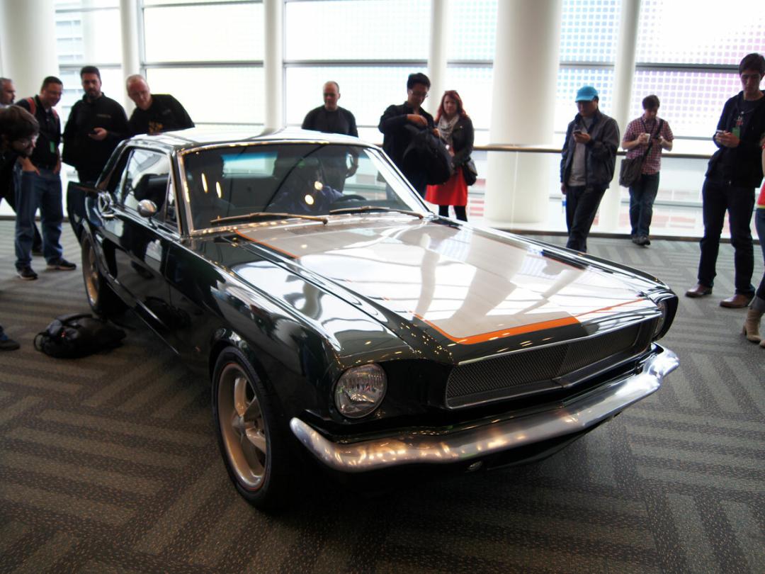 The gorgeous Ford Mustang before us was built in 1965, but its dashboard had been brought into the 21st Century with the addition of one of Pioneer’s CarPlay-toting head units, and while we’re not sure having the screen that low in the cockpit is necessarily the best idea, the mix of old and new was still very hard to resist.