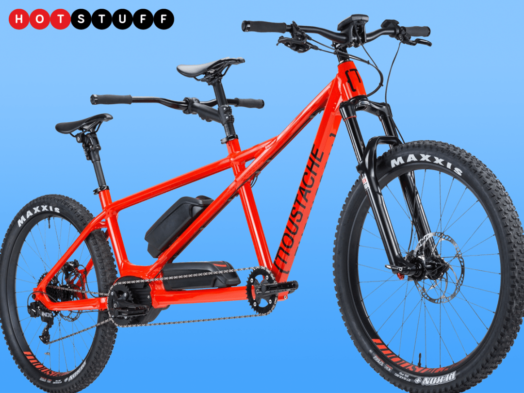 Ah, meet the Samedi 27 X2. It’s an e-tandem. French e-bike specialist Moustache has employed some cunning engineering so that the electric assistance to the wheels is uniform regardless of what irregular input is given to the front and rear pedals. The Bosch motor system is similar to that of other e-bikes – with varying Eco, Tour, Sport and Turbo assistance modes – but with a custom split cable allowing two 500wh batteries to be connected. Good, says the Samedi’s creator, for more than 60 miles depending on how much group effort you decide to put in, and whether you’re riding up Snowdon or just into Swindon.